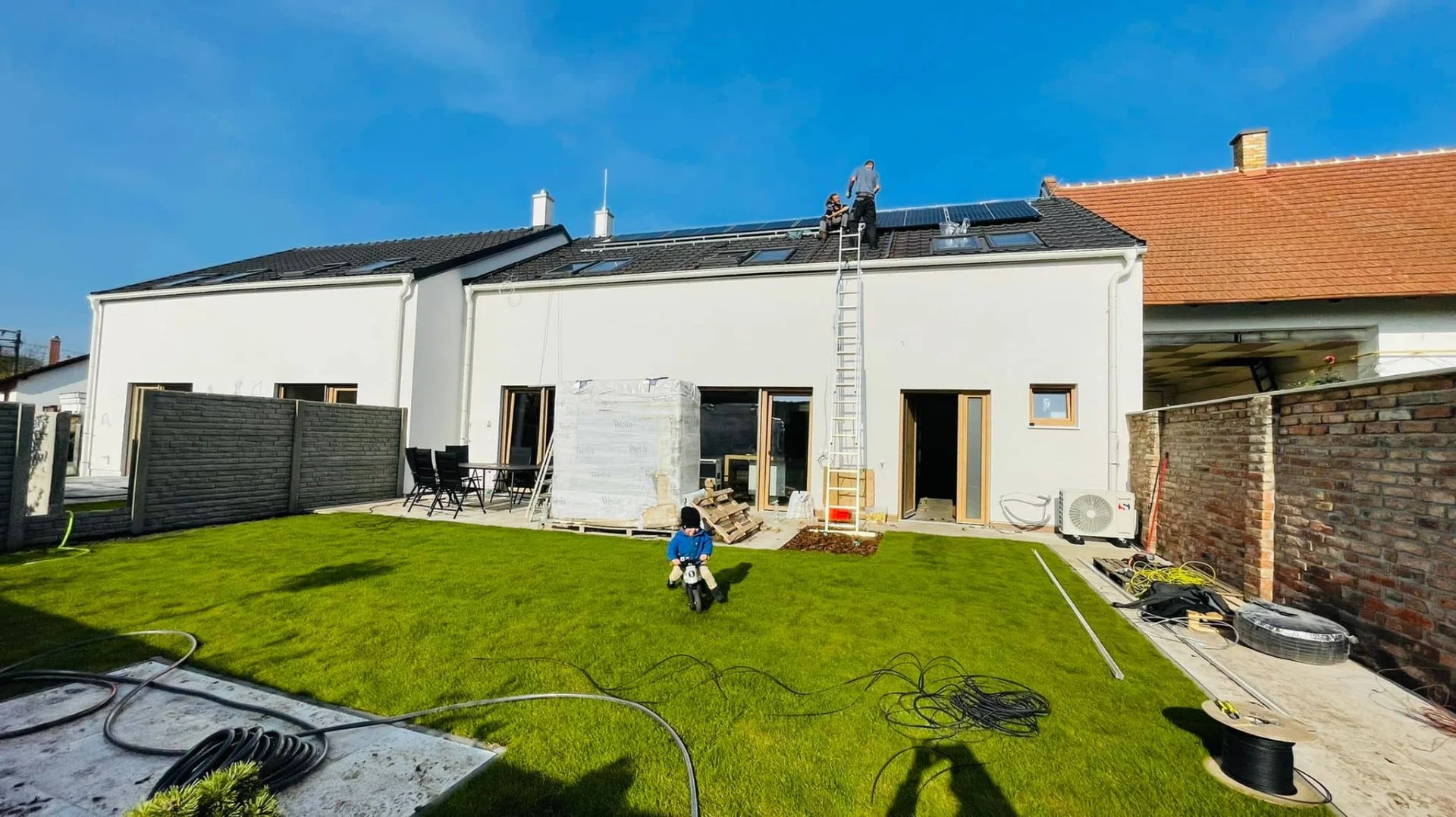 Zděná stavba je velmi dobře zateplena. Vytápění je podlahové, zdrojem tepla je tepelné čerpadlo vzduch-voda. Větrání rekuperací se instalovalo až posléze. Na střeše do zahrady je umístěna fotovoltaika. Dešťová voda je použita na zalévání zahrady. Okna jsou stíněna venkovními žaluziemi. Všechny výše uvedené prvky jsou součástí dotace včetně dotace na nezletilé děti.