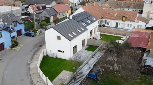 Na místě zbouraného domu na konci zástavby vznikly dva moderní úsporné domy. Vysokou dotaci na rekonstrukci mohla získat pouze stavba nalevo, jelikož byla umístěna přímo na původním zbouraném domě.